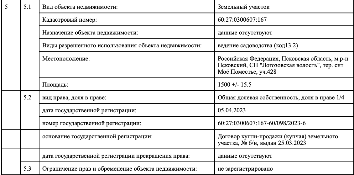 1/4 доли в праве общей долевой собственности на земельный участок площадью: 1500 кв.м., расположенного по адресу: Российская Федерация, Псковская область, м.р-н Псковский, СП "Логозовская волость", тер. снт