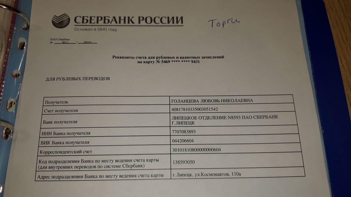 р/с - ФИО получателя Голанцева Любовь Николаевна № 40817810335003051542 в ПАО Сбербанк,г. Липецк, Липецкое отделение №8593, БИК 044206604, Кор/сч: 40817810335003051542