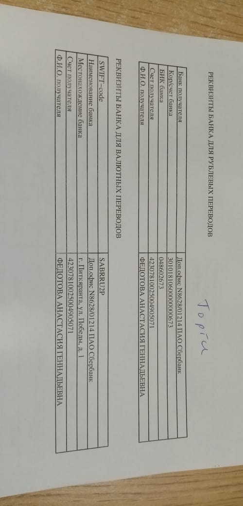 р/с - ФИО получателя Федотова Анастасия Геннадьевна № 42307810025004905071 в ПАО Сбербанк, доп. Офис № 8628/01212, БИК 048602673, Кор/сч: 30101810600000000673