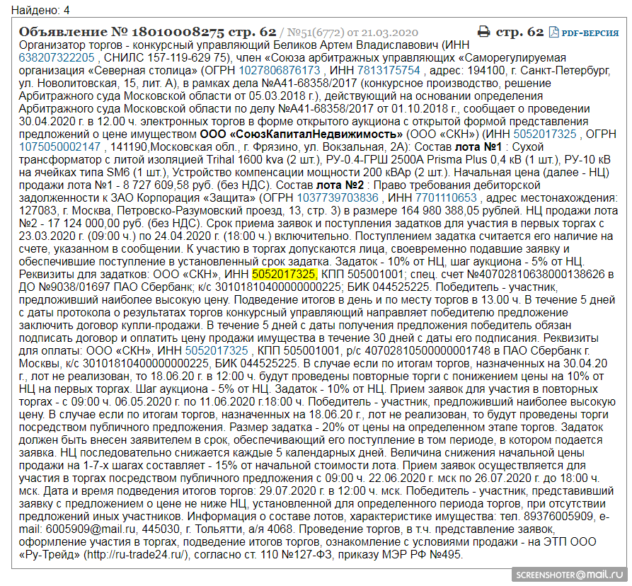 Срок приема заявок и поступления задатков для участия в первых торгах с 23.03.2020 г. (09:00 ч.) по 24.04.2020 г. (18:00 ч.) включительно. Поступлением задатка считается его наличие на счете, указанном в сообщении. Реквизиты для задатков: ООО «СКН», ИНН 5052017325, КПП 505001001; спец. счет №40702810638000138626 в ДО №9038/01697 ПАО Сбербанк; к/с 30101810400000000225; БИК 044525225. Суммы внесенных заявителями задатков возвращаются, за исключением победителя торгов, в течение пяти рабочих дней со дня подписания протокола о результатах проведения торгов.