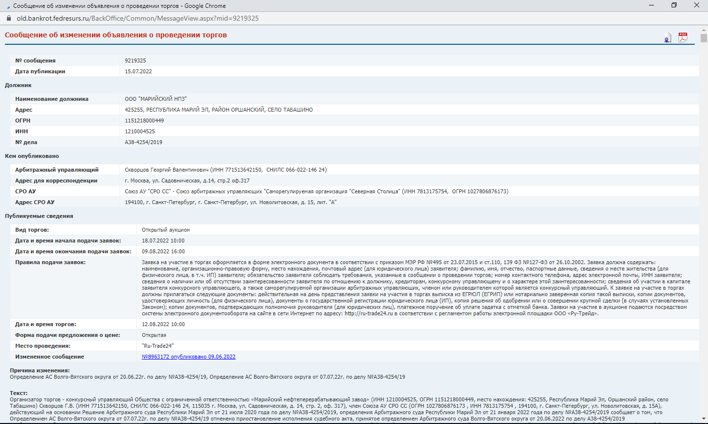 Документ, на основании которого сделано возобновление торгов CN=Скворцов Георгий Валентинович, SN=Скворцов, G=Георгий Валентинович, СНИЛС=06602214624, ИНН=771513642150, E=geo.skv@ya.ru